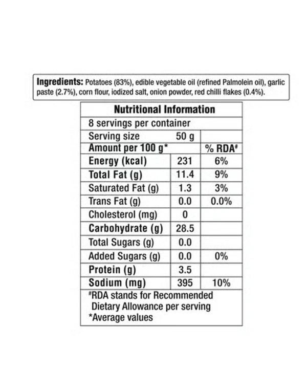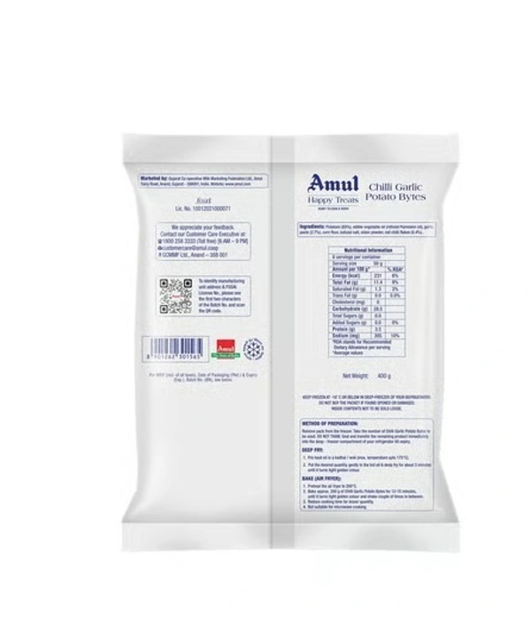 Amul Happy Treats Chilli Garlic Potato Bites are a delicious frozen snack made from seasoned potatoes blended with bold chilli and garlic flavours. Ready to cook and serve, they can be fried or baked to crispy perfection. Store in the freezer and cook straight without thawing for a quick, tasty treat anytime.