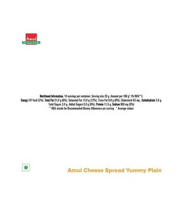 Amul Yummy Plain Cheese Spread 200 g is a smooth, creamy, and delicious cheese spread made from a blend of soft cheese and cheddar cheese. It has a mild, rich taste that makes it a perfect everyday spread for all age groups.