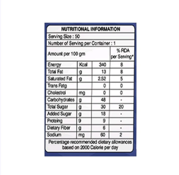Whole wheat flour, oats, jaggery powder, brown sugar, milk powder, sunflower oil, butter, blueberry, common salt, baking powder, rising agent (esooii), preservative (ins 202, ins 282), acidity regulator (ins 330)