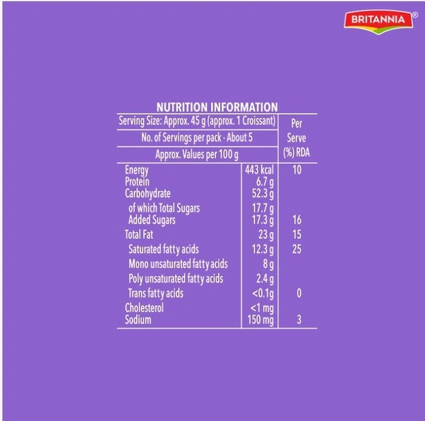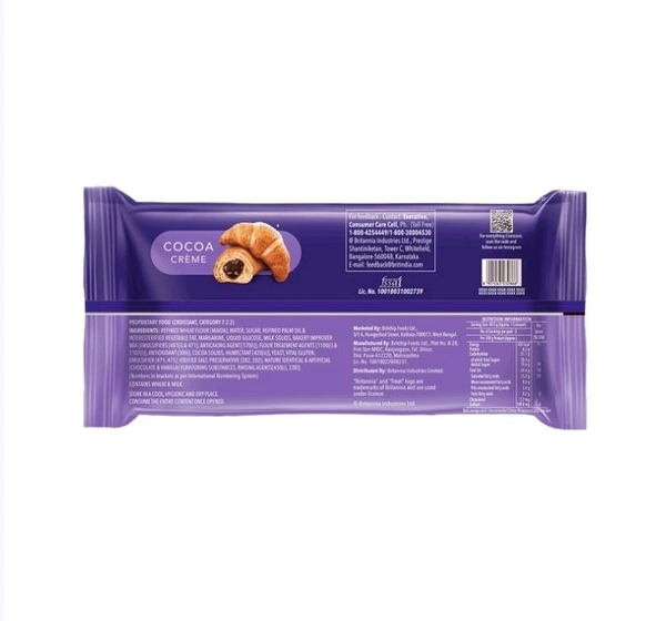 Treat your taste buds with this all-new indulgent Britannia Treat Croissant made using the best flour from across the country, kneaded into the softest dough, and baked to perfection. Every bite of the delicious treat gives the heavenly taste of smooth, velvety crème made with Cocoa, oozing out of layers of soft, fluffy bread that will melt in your mouth, creating an irresistible experience.