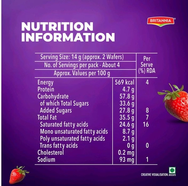 Britannia’s Strawberry Flavoured Wafer Biscuits are crafted to deliver a perfect melt-in-the-mouth experience. Our wafers combine crunchiness with sweet strawberry cream in every delightful bite
