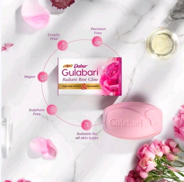 Gulabari Pure Rose Soap is enriched with Pure Rose extract and Niacinamide. This gentle soap hydrates the skin with Rose extract, leaving it soft and rejuvenated. Niacinamide brightens the complexion, evens skin tone, and unveils a radiant glow. Its antioxidant properties combat free radicals, reduce signs of aging, and promote youthful skin.