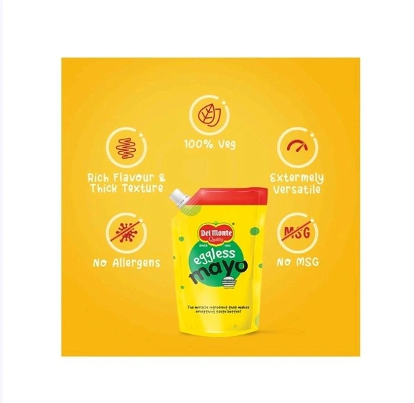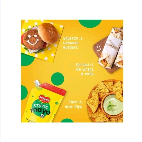 Del Monte Eggless Mayonnaise is deliciously, thick and creamy sauce. A versatile dressing, it is used as a spread in the preparation of sandwiches and salads, and as a filling in wraps, rolls, tacos, etc.