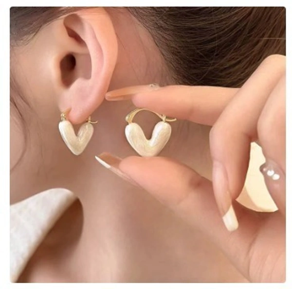 These are elegant heart-shaped earrings with a soft, modern design. The earrings feature a delicate gold-toned metal frame holding a smooth, pearly white heart insert that gives a subtle shine and classy look. The finish appears lightweight and polished, making them comfortable for everyday wear.