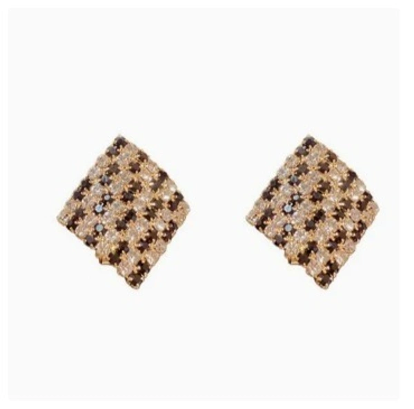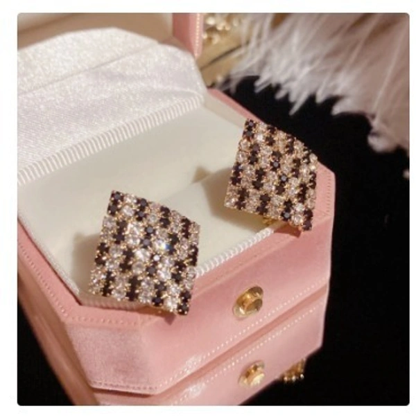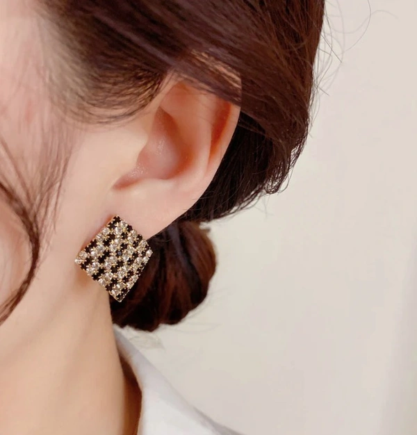 A stylish close-up of a woman’s ear adorned with a chic square stud earring. The earring features a grid-like design set in a gold-tone base, embellished with alternating black and sparkling clear stones that create a striking contrast. Its geometric pattern gives it a modern yet elegant appeal. The hair is neatly tied in a low bun with soft strands framing the ear, allowing the earring to stand out beautifully against a clean, minimal background