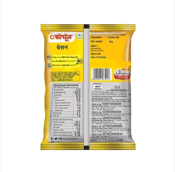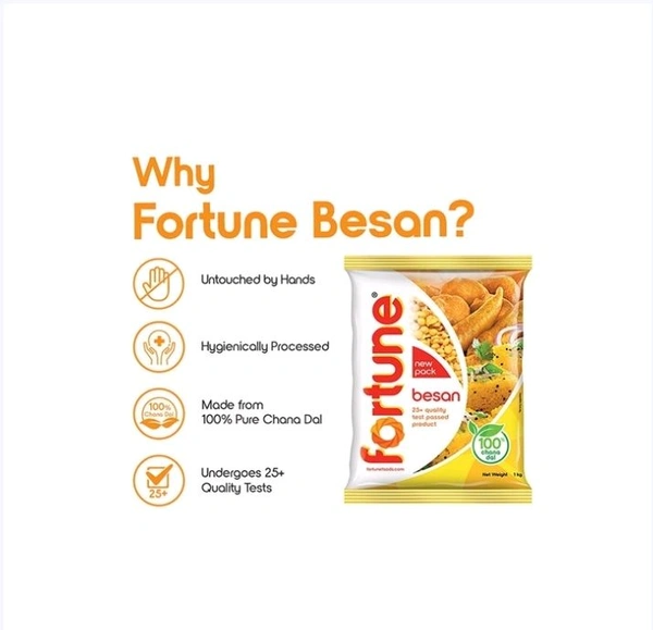 Fortune Besan is hygienic made from 100% chana dal and passes through more than 25 quality checks and processed with advanced grinding technology which retains the flavors and aroma of natural chana dal. Highest grade of chana dal and only standardized colored chana dal passes through our advanced color sortex machine for grinding to give consistency in Fortune Besan leading to the finest taste of any recipe.
