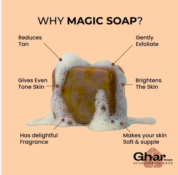 Bring back your natural glow with the Ghar Soaps Magic Soap, specifically formulated to target stubborn body tan and uneven skin tone. Infused with the time-tested benefits of Saffron and Sandalwood, this soap provides a luxurious, spa-like experience in every wash.