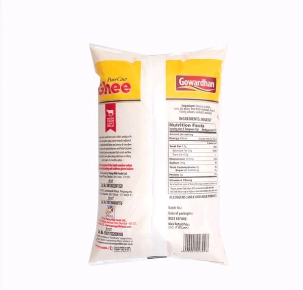 With a great aroma and taste, the Gowardhan Premium Cow Ghee give you an authentic flavour that is full of richness and aroma. It is nutritious and healthy, and gives you a great a taste with every mouthful. Made from pure Cow's milk for authenticity. Adds oodles of flavour and richness to dishes. Has rich characteristic aroma and delicious taste. Makes for a nutritious cooking medium. Offers great health and taste in every spoonful.