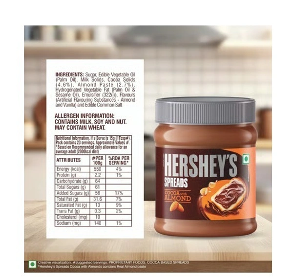 Hershey's Cocoa with Almond Chocolate Spread is a rich, creamy chocolate spread made with the goodness of cocoa and real almond paste. It offers a smooth texture with a delicious balance of chocolatey sweetness and nutty flavor, making it perfect for everyday snacking.
