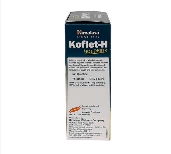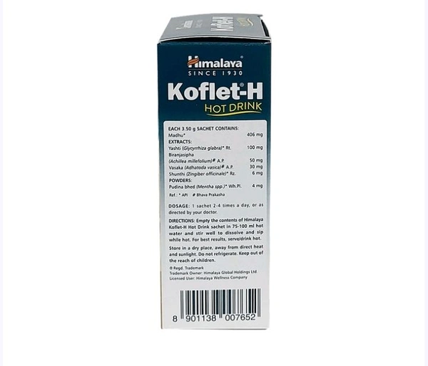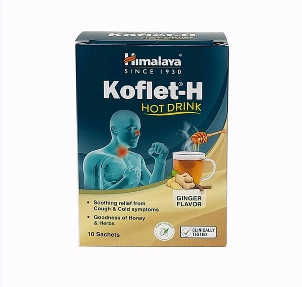 Himalaya Koflet-H Hot Drink is a herbal formula inspired by plant science. Enriched with the goodness of Honey, Ginger, Licorice, and Vasaka that provides a soothing effect and relieves your cough and cold symptoms.