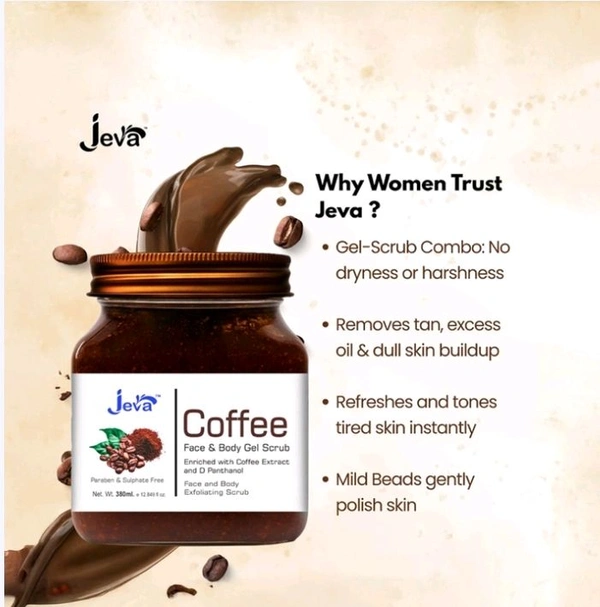 Jeva Coffee Face & Body Exfoliating Gel Scrub. Indulge your skin in a revitalizing spa-like experience with our Coffee Face & Body Exfoliating Gel Scrub. Specially formulated to gently polish and deeply cleanse, this dual-purpose exfoliator combines the energizing power of coffee with a lightweight gel texture to leave your skin feeling smooth.