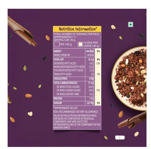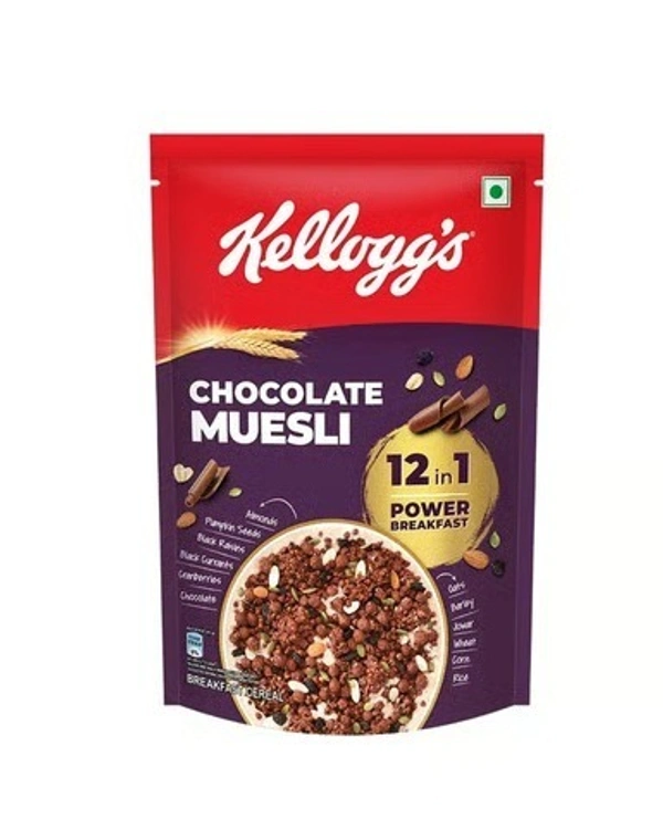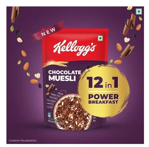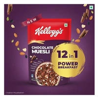 Kellogg's Chocolate Muesli: Fuel Your Day with the Wholesome Goodness of 57% Multigrain, Fruit, Nut & Seeds. This 7-in-1 Power Breakfast Features a Delicious Combination of Baked Grains like Oats, Rice, Wheat & Corn, and Nutritious Dried Fruits & Seeds including Almonds, Pumpkin Seeds, and Black Raisins. Start Your Morning Right with a Nutrient-Rich and Flavorful Experience.