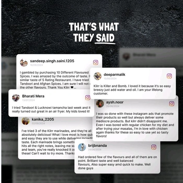 Our all-in-one chicken marination masala has everything you need for quickly marinating a flavorful chicken tikka at home. No chopping or grinding, just marinate chicken using KILRR chicken masala and fire it up. Delicious chicken tikkas, made easy!