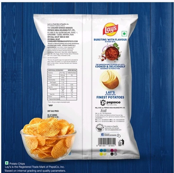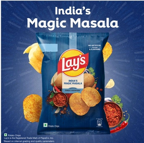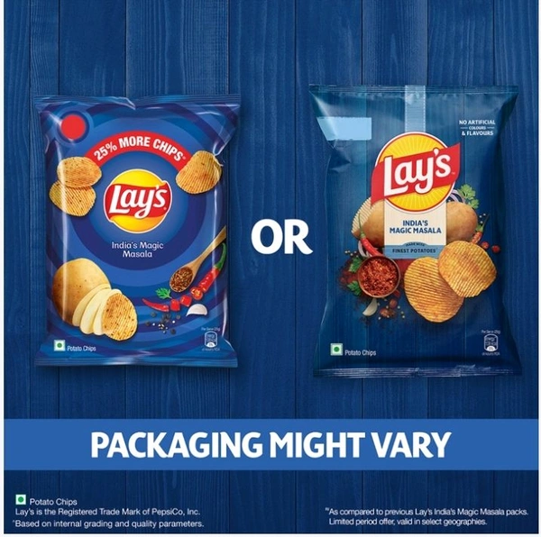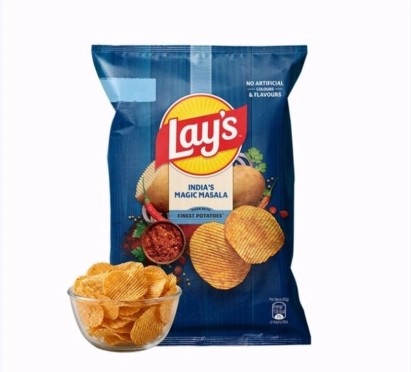 Binge on these exquisite bites of pure Masala magic! With hints of cumin, coriander, chili powder, onion, and garlic, Lay's India's Magic Masala is a one-way ticket to a world of exploding flavours. Experience this one-of-a-kind snack and indulge in the boldness of the Masala spice blend. Lay's India's Magic Masala chips are perfect for any occasion. From the quick snack breaks at work, to the impromptu get-togethers, this snack is perfect to binge on.