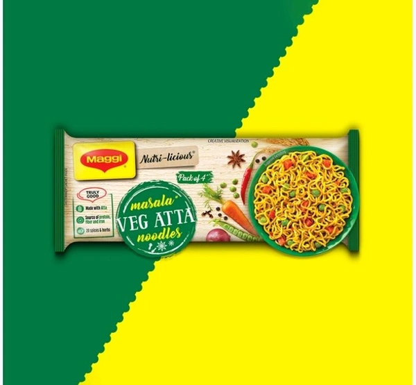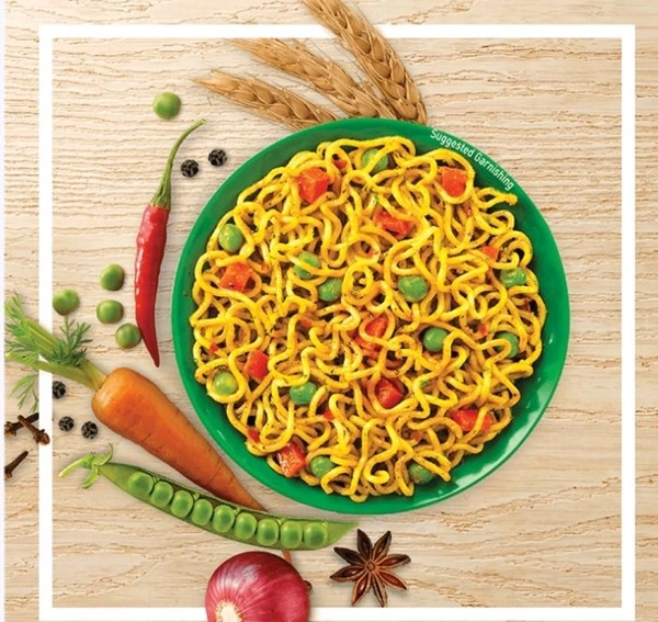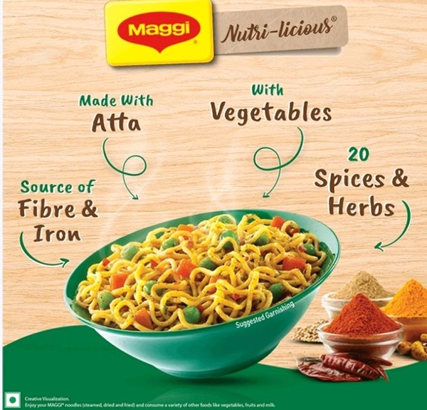 MAGGI Veg Atta Noodles Made with Atta and with colorful veggies! Enjoy the masaledar taste, as it is made delicious with 20 spices & herbs. MAGGI Veg Atta Noodles is a source of Iron, Fiber & Protein.