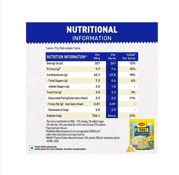 Maggi Cheese Macaroni Pazzta is delicious, quick and easy. The pasta is made with 100% suji/rawa (semolina) and is ready in just 5 minutes! It makes a great snacking option or sides for your everyday meals. Toss in some bell peppers or olives to make your pasta meal more wholesome and delicious! So now, go ahead and indulge yourself with the saucy & creamy flavors of Maggi Pazzta.