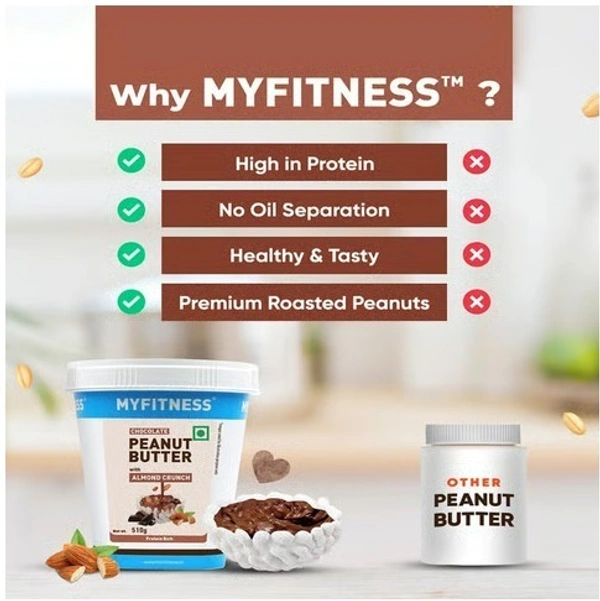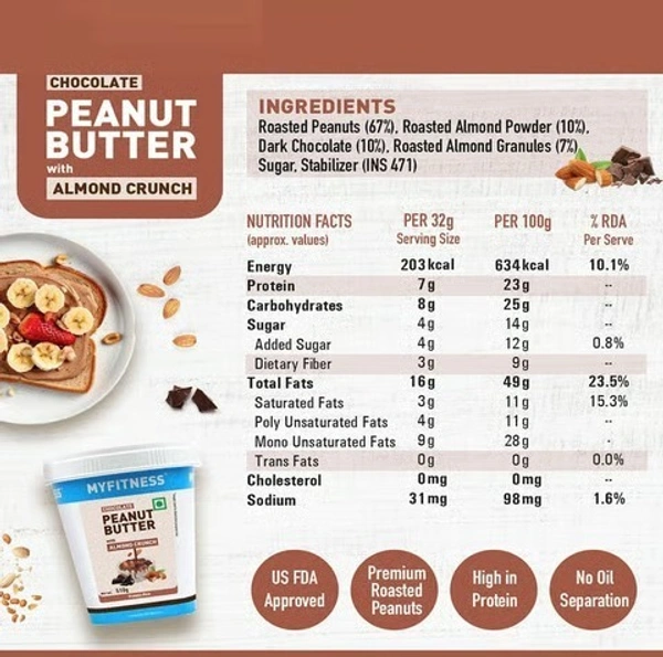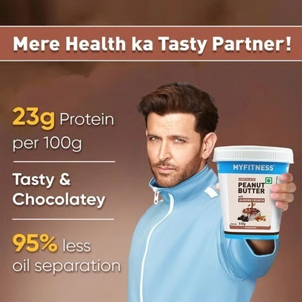 MyFitness Chocolate Peanut Butter with Almond Crunch is a delicious and nutritious spread made from high-quality roasted peanuts, rich dark chocolate, and crunchy almonds. It offers a perfect balance of creamy texture and nutty crunch, making every bite indulgent yet satisfying.
