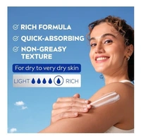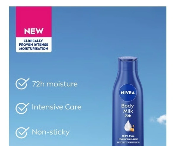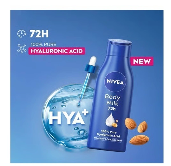 Experience intense moisture and lasting freshness with NIVEA Nourishing Body Milk Body Lotion enriched with Pure Hyaluronic Acid to deliver up to 72-hour hydration to extra dry and sensitive skin. This body lotion blends skin-softening Almond Oil and a Deep Moisture Serum that penetrates deeply to replenish moisture lost from daily wear and environmental stressors. From the very first application, dry patches become visibly smoother; skin feels nourished, calm and supple. The gentle formula, dermatologically tested, suits sensitive skin types and leaves no greasy residue—just silky softness and a healthy glow. Ideal for those who use soaps or lighter lotions that just don't cut it, this body milk steps up your skincare routine. Whether after bath, before bed, or for daily care, it helps prevent dryness and supports skin’s natural moisture barrier. Key Benefits: Deep nourishment for very dry, sensitive skin! Long-lasting 72Hr hydration thanks to new formula with Pure Hyaluron Restores softness and smoothness with Almond Oil & Deep Moisture Serum Lightweight feel, non-greasy finish, and skin comfort Ideal for daily use: Apply daily for intensive moisture care & to reduce roughness of dry skin. Skin Type: It effectively transforms very dry skin to healthy, smooth skin.; Skin compatibility dermatologically approved. Target Gender: Unisex NIVEA, a hundred years of skincare for life!