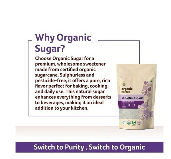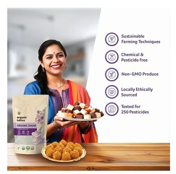 Add that sweet flavour to your desserts with Organic Tattva Sugar that is made with the best quality sugarcane, sugar has a high calorie content and can give you a quick energy boost, it is free of any harmful chemicals such as sulphur, use it to sweeten your beverages or make delicious desserts.