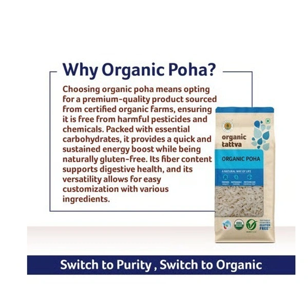Organic Tattva Poha is of premium quality, without any pesticides and chemicals, procured from certified sources. Poha is a good source of energy.