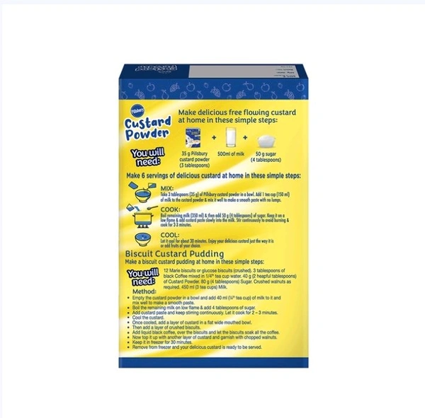 Make a rich, creamy dessert with Pillsbury Golden Vanilla Custard Powder. These delicious custards can be served plain or dressed up and set into jellies, truffles, cakes, pastry fillings and much more.
