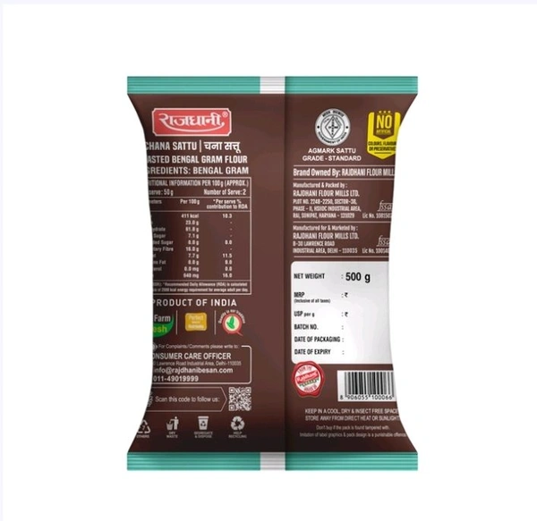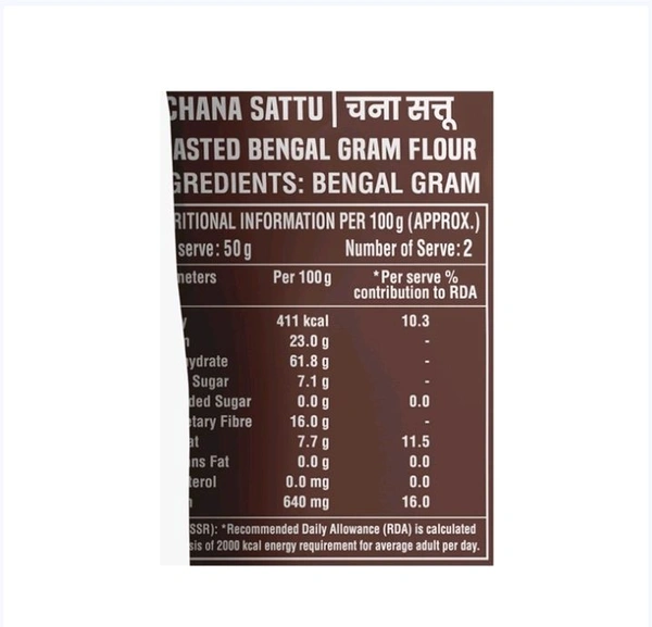 Chana Gram Sattu important vitamins - A & C, minerals and calcium, Totally natural, no added colors or preservatives /Energy 400.34 (kcal) Protein 21.19%