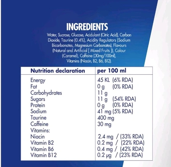 Red Bull Energy Drink is a functional beverage that vitalizes body and mind. Its special formula includes caffeine, taurine, B-group vitamins, sucrose, glucose, and Alpine spring water. Caffeine and taurine support alertness and body function, while B-vitamins aid energy metabolism. Made with sugar from sugar beets and natural water, it's crafted for energy and focus.
