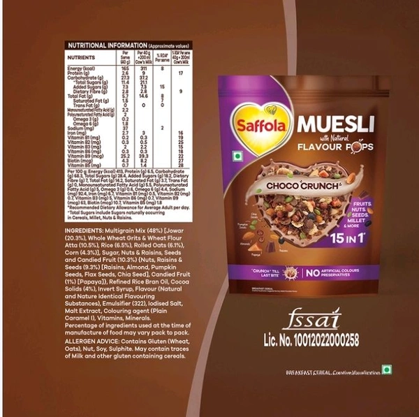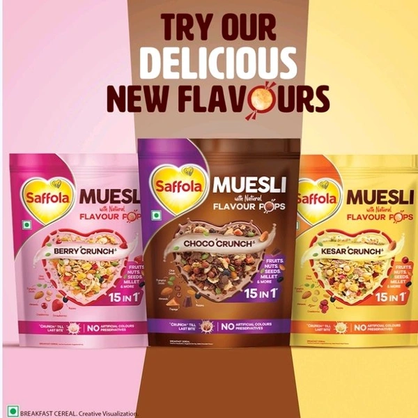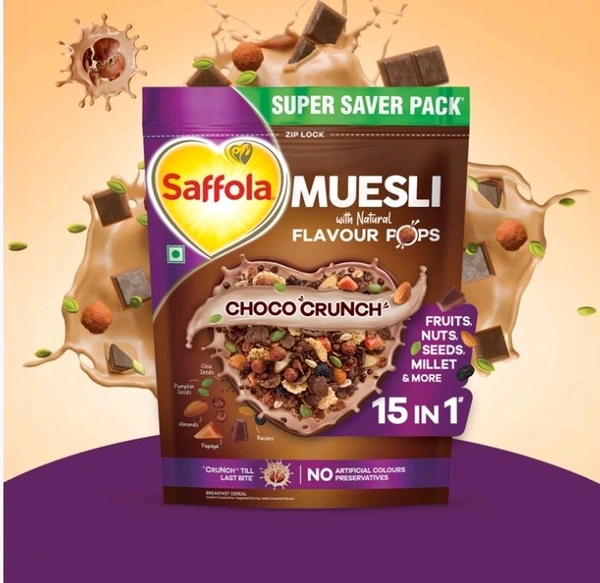 Perfect for busy mornings or a quick healthy bite anytime, Saffola Muesli Choco Crunch combines taste and health in every spoonful.