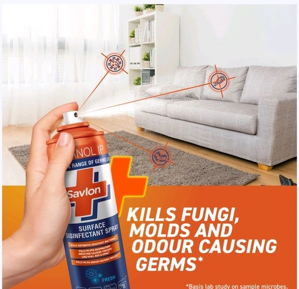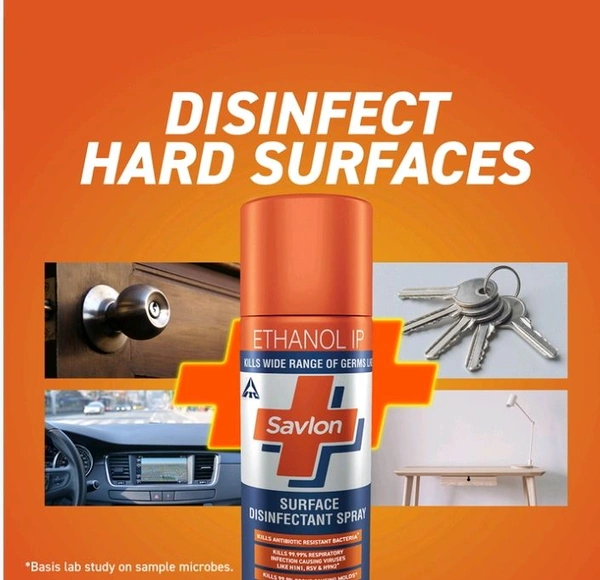 A wide variety of high traffic surfaces such as tables, door handles, chairs, carpets, curtains etc.are touched often by a number of different people and are a reservoir for a wide variety of germs and bacteria. Introducing, Savlon Surface Disinfectant Spray which will help keep you and your loved ones safe by killing a wide range of germs like bacteria, fungi, molds & virus. This versatile spray disinfects and deodorizes in one easy step. Savlon's unique spray formula can be used on various hard & soft surfaces to kill 99.99% germs around your home and leave the house smelling fresh and pleasant. It is also effective in killing H1N1, rotavirus and norovirus. Its active ingredient also kills antibiotic resistant germs. To use, shake the can. Hold the can at a distance of 15-20 cm on the desired surface to be disinfected and spray such that the surface is covered in mist. There is no need to wipe the surface. Allow it to air dry. Do not use on copper, brass, painted/shellacked/lacquered/ varnished surfaces (including treated/polished wood) or acrylic plastics. Basis in vitro study.