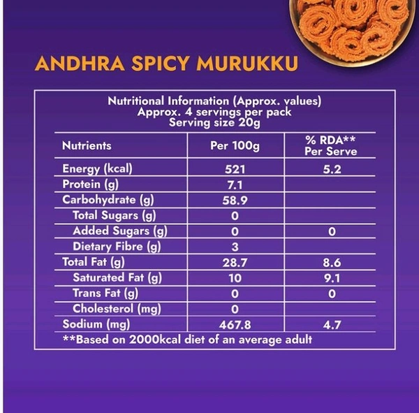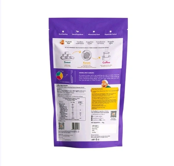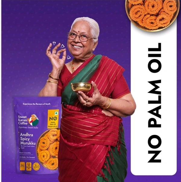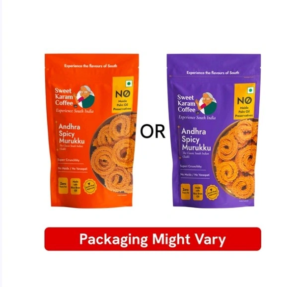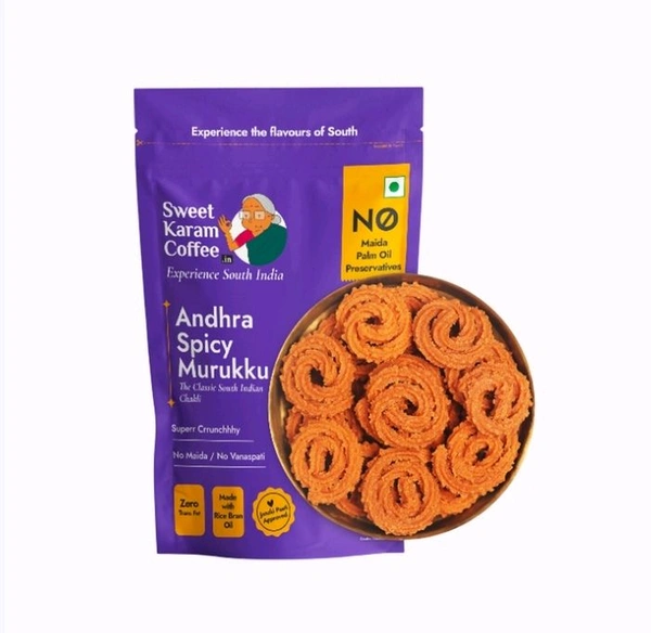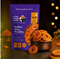 Discover the authentic taste of Andhra Pradesh with Sweet Karam Coffee's Andhra Spicy Murukku. Made from premium rice flour and urad dal flour, and seasoned with traditional spices, this crunchy snack delivers genuine South Indian flavor. Our murukku is crafted with care, using time-honored recipes, and is free from palm oil, maida, preservatives, and additives.
