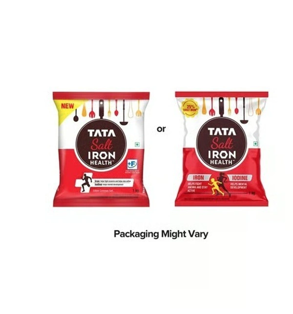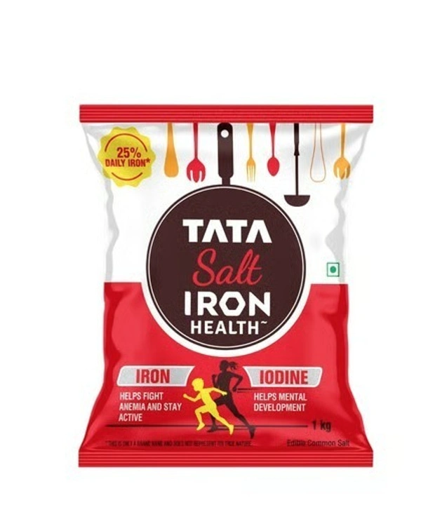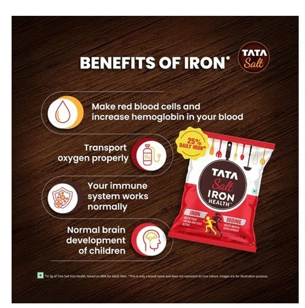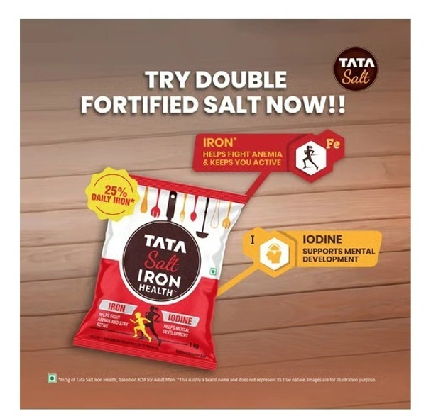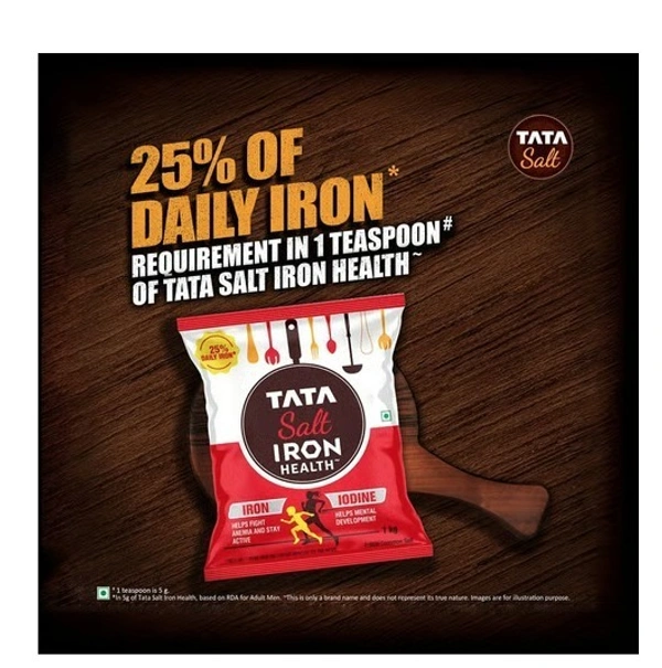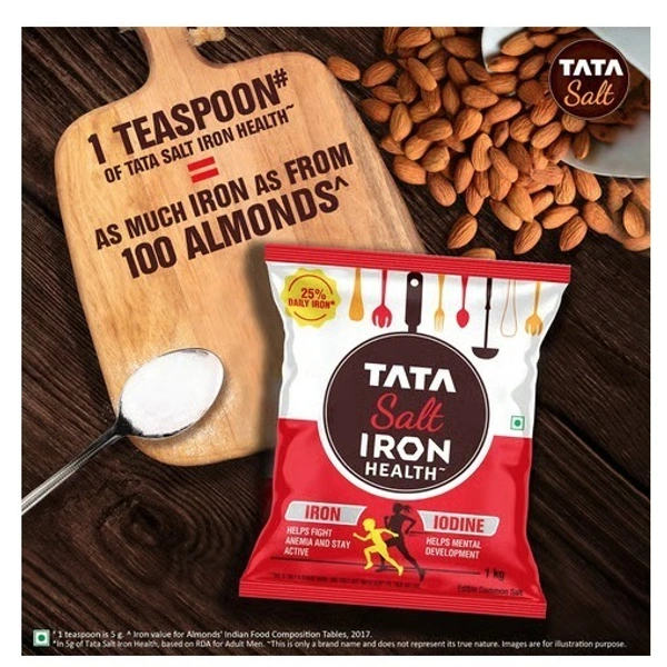 Tata Salt Iron Health, a double-fortified salt with Iron & Iodine, provides the same Iron as 100 almonds in just one teaspoon, helping meet 25% of daily Iron needs. Iron supports hemoglobin, oxygen transport & immunity, while Iodine aids mental development, cognition & thyroid health—making it a smart choice for your family. Brand name only. Based on RDA for Adult Men. IFCT 2017