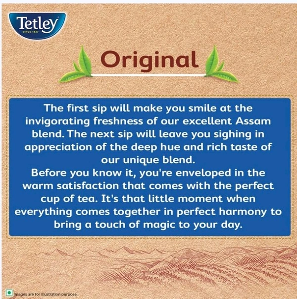Now refresh, rejuvenate and relax with Tetley. Tetley Original which makes you feel refreshed with every sip. The first sip will make you smile at the invigorating freshness of our excellent Assam blend. The next sip will leave you sighing in appreciation of the deep hue and rich taste of our unique blend. Before you know it, you're enveloped in the warm satisfaction that comes with the perfect cup of tea. It's that little moment when everything comes together in perfect harmony to bring a touch of magic to your day.