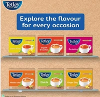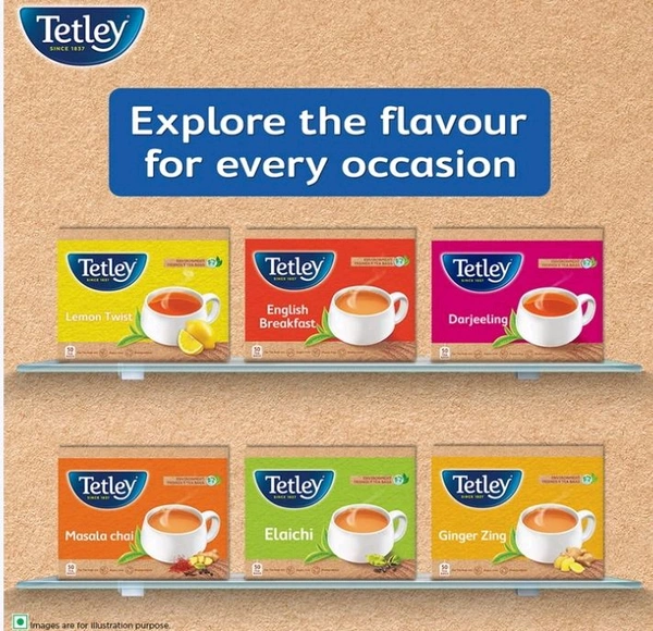 Tetley is available in a variety of black tea flavours, including Tetley Ginger Zing, Lemon Twist, Masala Chai, Elaichi, Darjeeling, and English Breakfast.