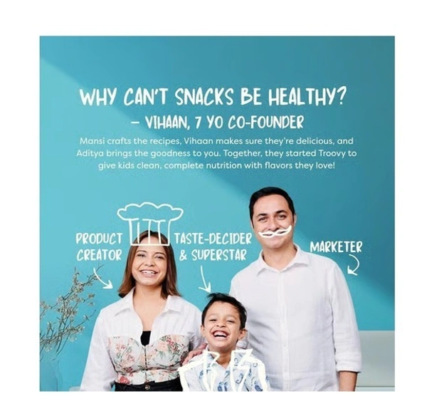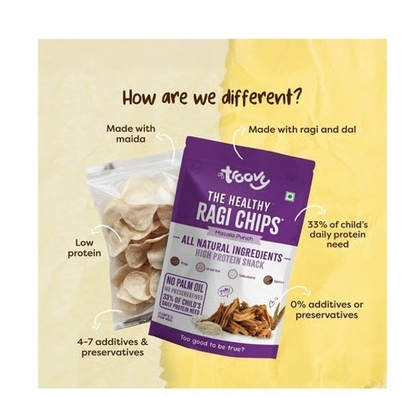 Troovy's Healthy Ragi Twists in in Masala punch flavor, made with millets and a burst of protein to make your snacking treats healthy No artificial preservatives and Protein-loaded Moong Dal munchies Seasoned with Himalayan Pink Salt Has 33% of child's daily protein needed No junk- No palm oil, No trans fat, No maida Deliciously seasoned, crunchy and wholesome