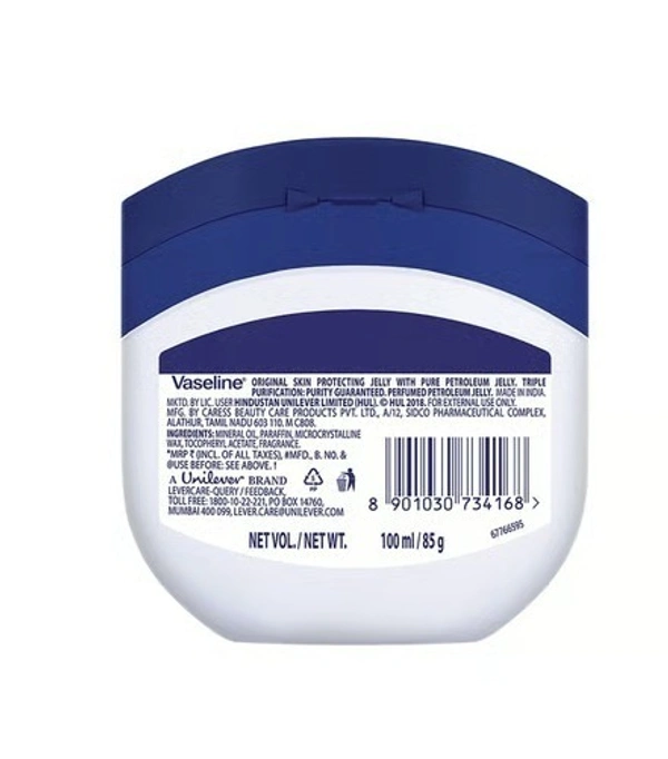 Vaseline petroleum jelly is triple purified, it helps retain moisture and gives you soft skin. Hands, lips, heels, skin – Vaseline petroleum Jelly is for everything. Vaseline petroleum jelly protects your skin from tough skin problems in the harsh winter. The Vaseline petroleum jelly is a true all-rounder which is best for dull skin, cracked skin, or dry skin during harsh winters. It helps to give you soft hands, soft lips, soft heels, and soft skin. This skin protectant provides your dry skin with long-lasting moisture. Its triple-purified advanced solution feels gentle on your skin. It gives you smooth and even looking skin avoiding dryness and preventing pore clogging. Whether it is your heels, lips, elbows or your hands, this effective skin protectant keeps your skin from chapping. It helps to give you nourished and healthy skin. This petroleum jelly is gentle on your skin, dermatologist tested, and non-comedogenic (won’t clog pores). A small drop of Vaseline can work wonders on your skin. One jelly, multiple benefits - Smooth lips, soft heels, healthy elbows.