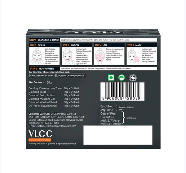 Our Diamond Facial Kit is a skin polishing, at-home facial kit that offers you skin purification and a sparkling finish; fights premature signs of aging, fine lines, and age spots effectively. This Diamond Facial Kit enhances your skin's natural defense system, improves skin elasticity, and brightens and lightens patchy and damaged skin. The Diamond Facial Kit is an easy 6-step routine that helps minimize the effects of aging on your skin and keep it looking younger.